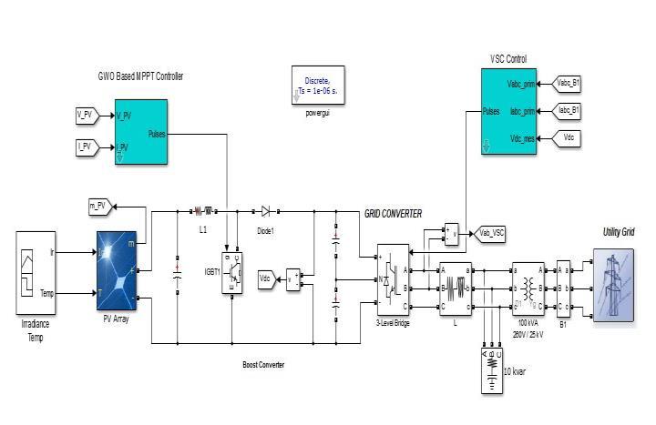 This work presents the Grey Wolf Optimized (GWO) algorithm-basedconvertercontrollertechniqueforgrid-tied photovoltaic systems. An entirely new optimization technique is suggested for the STATCOM control system to fine-tune the PI Controller. In MATLAB, a 100 KW photovoltaic grid system is simulated. Below is the Block Diagram.