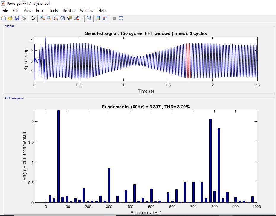 The grid voltage maintains constant irrespective fluctuations in temperature and irradiance, as represented bytheprecededfigure.TheTHDinthiscaseis3.29%.