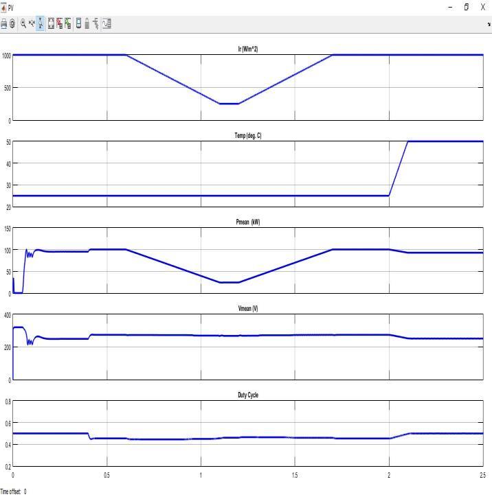 This figure displays the variable temperature and variable irradiance. Mean Power, Duty Cycle, and Mean Voltage. The dutycycleoscillations,meanpower,andmeanvoltageexits. ThePVmodule'soutputpoweris273.5Vwhenoperatingat 1000 W/m2 at 25 degrees Celsius, which is the maximum powerof100.7KW.ThePVmodule'soutput poweris265.1 Vwhenoperatingat250W/m2at25degreesCelsius,which isthemaximumpowerof24.4KW.Themaximumpowerat 1000 W/m2 and 50 degrees Celsius is 92.9 KW, and under these circumstances, the PV module's output power is 92.9kW. The PV module's maximum power at 1000 W/m2 and 50 degrees Celsius is 92.9 KW, and its output power is 250.2Vunderthesecircumstances.