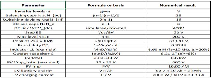 SolarpanelvoltageisboostedfortheEVvehicletocharge thebattery.Theoutputofthesolarsystemis400V.andfrom thedc/dcboostconvertergettheoutputvoltageis400V. and the current is 9.36 amps and the battery will charge fromthesolarpanel.Thefinaloutputofthe9-levelSVPWM flyingcapacitormultilevelinverterofthePVarrayishalfof theinputvoltage.Theinputofthe9-levelSVPWMinverter from the PV array is 400v and the output voltage is 240 Voltage, This is the off-grid system. solar panel installed capacity is 12kw. total consumption of our home is 2kw. totalandEVbatteryconsumptionis3kwIcaneasilyusethe powerofthesolartooperatethehomeandbatterywiththe 9-levelflyingcapacitormulti-levelinverter.