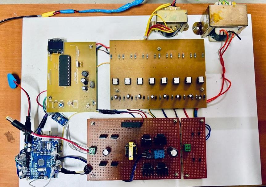 ThetestingsetupoftheDualActiveBridge(DAB)converter wascreatedtotesttheperformanceoftheDABconverter systeminanactualfast-chargingscenario.TheDABsystem consistsoftwofull-bridgeconverterstagesconnectedviaa high-frequencyisolationtransformer.Theprimarybridgeis supplied with a regulated DC supply acting as a charging source, while a programmable DC load (or an EV battery emulator) is connected to the secondary bridge. Both the primaryandsecondarybridgesareusinghighspeedSiCor GaN MOSFETs as the switching devices to minimize conductionlossesandprovideefficientoperationatelevated frequencies.TheArduinomicrocontrollerorDSPcontroller generatesthecontrolsignalsfortheswitches,implementing the phase- shift modulation (PSM) strategy. A gate driver circuit supplies voltage isolation and drives the MOSFET gateswithprecisetiming.Thewholeassemblyisplacedon an insulated base and equipped with heat sinks and aircoolingforthermaldissipationduringoperation.