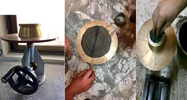 Compaction was performed on a mechanical jolting table (Figure 5) using 60 drops from a height of 12.5 mm to remove entrapped air and achieve uniform density while limitingfibersegregation.