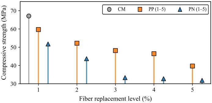 PPfibersretainhighercompressivestrengthatalldosages than PN fibers, indicating better compatibility with the cementmatrixandmoreuniformdispersion.
