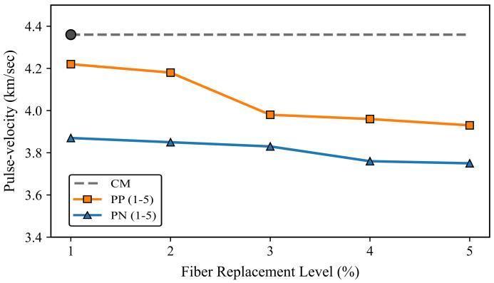 UPVvaluesfollowthesametrendascompressivestrength. The control mix shows the highest pulse velocity (4.36 km/s), consistent with a dense and relatively defect-free microstructure. As fiber content increases, UPV gradually decreases: PP mixes remain in the 3.93–4.22 km/s range, whereasPNmixesfallto3.75–3.87km/s.