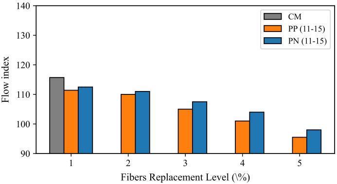 Both PP and PN fibers cause a clear, approximately linear reduction in flow with increasing dosage. At 5% fiber content,theflowindexdecreasesbyabout17%forPPmixes and 15% for PN mixes relative to the control. The stronger reduction in PP mixes is consistent with their higher aspect ratioandfinerdiameter,whichincreaseinternalfrictionand restrictmortarflowmorethanthecoarserPNfibers.