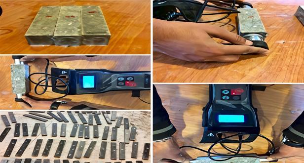 Ultrasonic pulse velocity (UPV) was measured using the direct transmission method (Figure 7). Matched 54 kHz transducers were placed on opposite faces of the specimen withcouplinggel to ensurepropercontact.Transittime was recorded witha resolution of ±01 µsandUPV wasobtained bydividingthespecimenlengthbythemeasuredtraveltime,