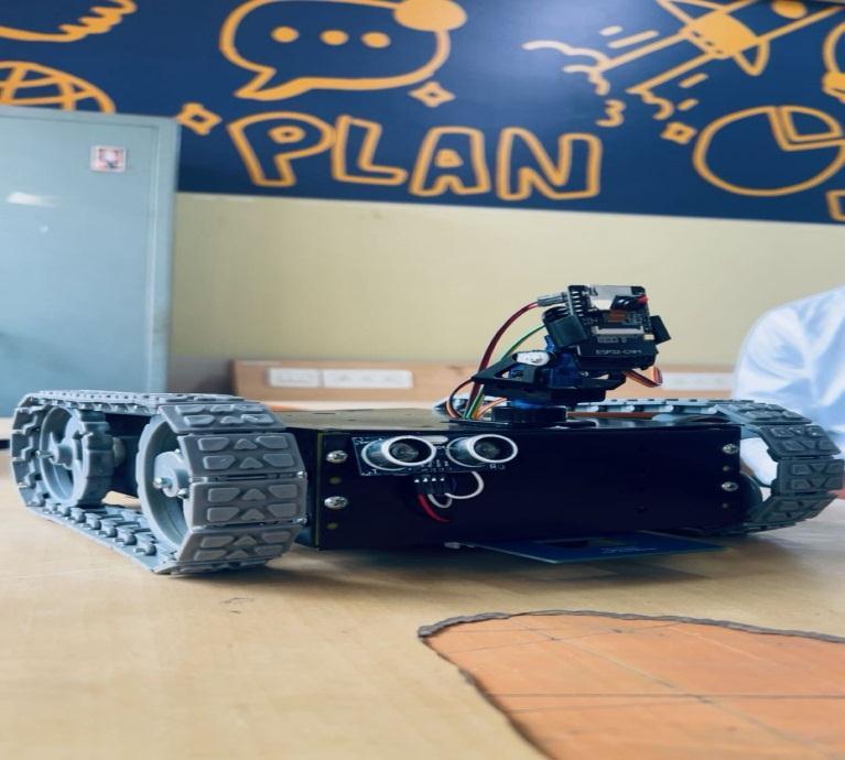 The above image clearly emphasizes the physical structureoftherobotandtheplacementofkeyhardware components in the system. The ESP32-CAM module is installed at the front of the robot to perform live streaming, and the ultrasonic sensor is well-installed to detect any obstacles in its way as it travels with its DC motorsandpowersystemunit.