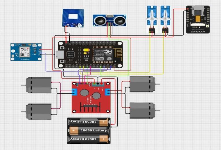 TheNodeMCUESP8266is usedasthecontrol unit and is responsible for communication with sensors/motors and Android applications. The communication is carried out viaWi-Fi.AnESP32-CAMmoduleisusedatthefrontofthe robottotransmitlivevideos.Theultrasonicsensorisused forobstacledetection.DCmotorsareusedformovements. Theyarecontrolledusingamotordriver.