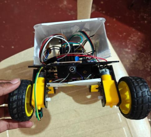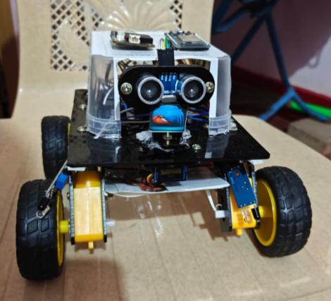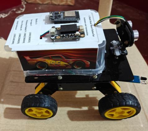 The Design and developing a 4-wheel differential drive mechanism for robot movement. Considering the Servo-mountedultrasonicsensorforscanningleft,rightand front.IRsensorsplacedforwardtiltedtowardsleftandright both side each. Ensuring emergency stop during sudden obstacle.