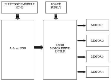 The diagram shows how the voice-controlled robotic car works internally by connecting different components together. TheBluetoothHC-05modulereceivesthevoice-basedcommandssentfromthemobileappandpassesthemtotheArduino Uno, which acts as the main controller. The Arduino interprets these commands and sends control signals to the L293D motordrivershield.Themotordriverprovidestherequiredpowertothemotors,astheArduinoalonecannotdrivethem directly. A power supply, usually a rechargeable battery, powers all the modules, including the Arduino, Bluetooth unit, andmotors.Themotors(Motor1,Motor2,Motor3,Motor4)thenrotateaccordingtotheinstructions,allowingthecarto moveforward,backward,left,orright.