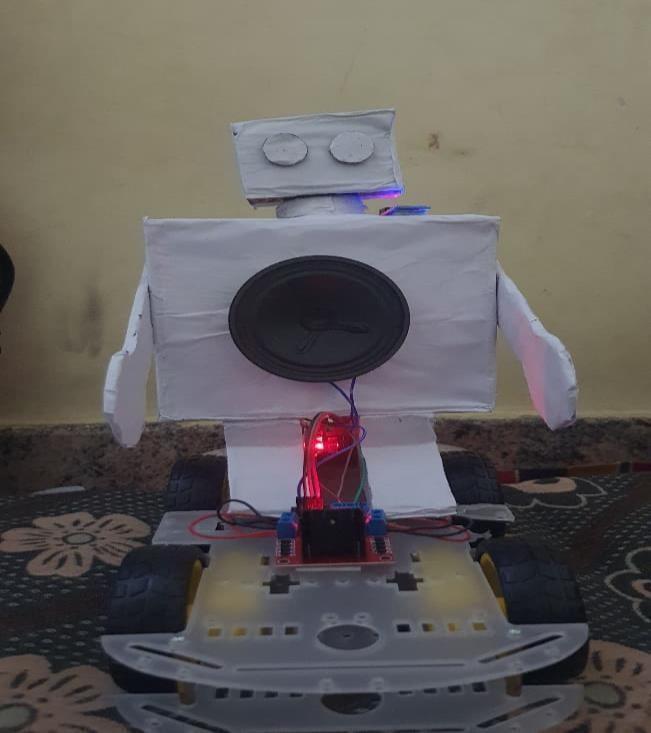 Toenhancetheuserexperience,aDFPlayerMiniaudiomodulecanbeconnected,whichplaysprerecordedaudioclipslike “Moving Forward” or “Stopping” whenever a command is executed. This acts as confirmation feedback for the user. The wiring connections between the Arduino, motor driver, motors, Bluetooth module, and battery are arranged on a stable robotic chassis to ensure smooth movement and durability. Finally, the system is tested by sending different voice commandsfromtheAndroidapp.