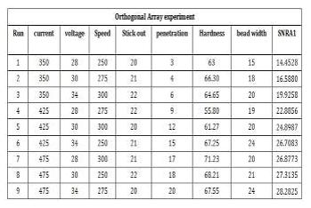TheTaguchiapproachofexperimentdesignoptimizesthe cost-effective arrangement of welding experiments. According to the ANOVA results, welding current and arc voltage are the important welding process variables that impactthehardnessandbreadthoftheweldbeads.Using input variables, the output values for MINITAB17's bead width,hardness,andpenetrationarecomputed.