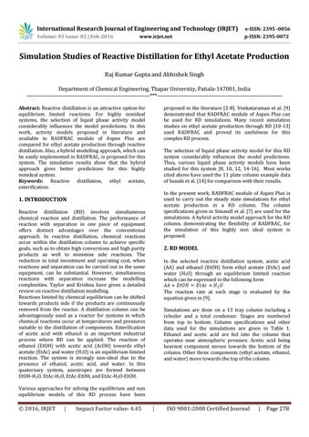 Simulation Studies of Reactive Distillation for Ethyl Acetate Production Raj Kumar Gupta and Abhishek Singh Department of Chemical Engineering, Thapar University, Patiala-147001, India -----------------------------------------------------------------***-----------------------------------------------------------------Abstract: Reactive distillation is an attractive option for equilibrium limited reactions. For highly nonideal systems, the selection of liquid phase activity model considerably influences the model predictions. In this work, activity models proposed in literature and available in RADFRAC module of Aspen Plus are compared for ethyl acetate production through reactive distillation. Also, a hybrid modelling approach, which can be easily implemented in RADFRAC, is proposed for this system. The simulation results show that the hybrid approach gives better predictions for this highly nonideal system. Keywords: Reactive distillation, ethyl acetate, esterification.
