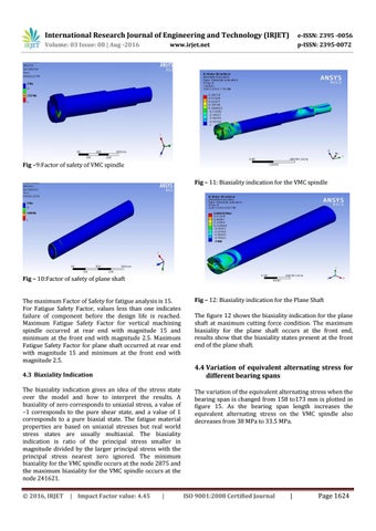 Fig – 10:Factor of safety of plane shaft The maximum Factor of Safety for fatigue analysis is 15. For Fatigue Safety Factor, values less than one indicates failure of component before the design life is reached. Maximum Fatigue Safety Factor for vertical machining spindle occurred at rear end with magnitude 15 and minimum at the front end with magnitude 2.5. Maximum Fatigue Safety Factor for plane shaft occurred at rear end with magnitude 15 and minimum at the front end with magnitude 2.5. 4.3 Biaxiality Indication The biaxiality indication gives an idea of the stress state over the model and how to interpret the results. A biaxiality of zero corresponds to uniaxial stress, a value of –1 corresponds to the pure shear state, and a value of 1 corresponds to a pure biaxial state. The fatigue material properties are based on uniaxial stresses but real world stress states are usually multiaxial. The biaxiality indication is ratio of the principal stress smaller in magnitude divided by the larger principal stress with the principal stress nearest zero ignored. The minimum biaxiality for the VMC spindle occurs at the node 2875 and the maximum biaxiality for the VMC spindle occurs at the node 241621. © 2016, IRJET