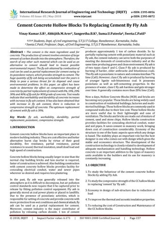 Cement Concrete Hollow Blocks To Replacing Cement By Fly Ash Vinay Kumar.S.R1, Abhijith.M.Arer2, Sangeetha.B.K3, Suma.U.Pateela4, Sweta.C.Patil5 Students, Dept. of civil engineering, S.T.J.I.T College, Ranebennur, Karnataka, India. Professor, Dept., of Civil Engineering, S.T.J.I.T Ranebennur, Karnataka, India. ---------------------------------------------------------------------***--------------------------------------------------------------------1,2,3,4