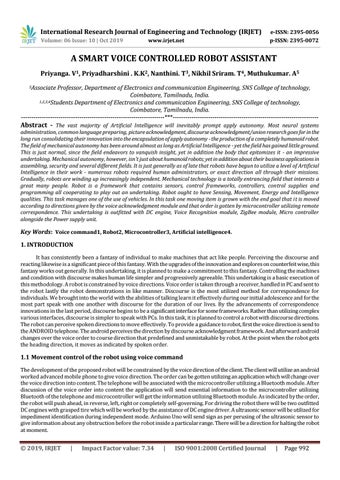 A SMART VOICE CONTROLLED ROBOT ASSISTANT Priyanga. V1, Priyadharshini . K.K2, Nanthini. T3, Nikhil Sriram. T4, Muthukumar. A5 5Associate