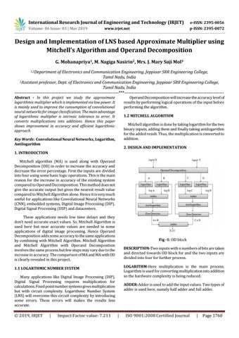 of Electronics and Communication Engineering, Jeppiaar SRR Engineering College, Tamil Nadu, India 3Assistant professor, Dept. of Electronics and Communication Engineering, Jeppiaar SRR Engineering College, Tamil Nadu, India -----------------------------------------------------------------------***-------------------------------------------------------------------Abstract - In this project we study the approximate logarithmic multiplier which is implemented via low power. It is mainly used to improve the consumption of convolutional neural networks for image classification. The main advantage of logarithmic multiplier is intrinsic tolerance to error. It converts multiplications into additions. Hence this paper shows improvement in accuracy and efficient logarithmic approach.