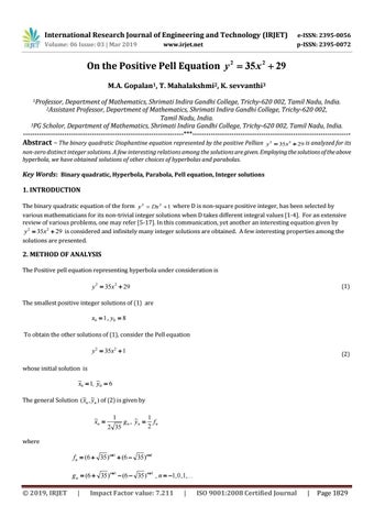 Key Words: Binary quadratic, Hyperbola, Parabola, Pell equation, Integer solutions 1. INTRODUCTION The binary quadratic equation of the form y 2 Dx 2 1 where D is non-square positive integer, has been selected by various mathematicians for its non-trivial integer solutions when D takes different integral values [1-4]. For an extensive review of various problems, one may refer [5-17]. In this communication, yet another an interesting equation given by y 2 35x 2 29 is considered and infinitely many integer solutions are obtained. A few interesting properties among the solutions are presented.