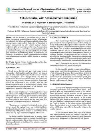 Student, Valliammai Engineering College, Electronics and Instrumentation Department, Kanchipuram Tamil Nadu, India 4Professor & HOD, Valliammai Engineering College, Electronics and Instrumentation Department, Kanchipuram Tamil Nadu, India ---------------------------------------------------------------------***---------------------------------------------------------------------Abstract – It has become an essential necessity to have a proper check on the condition of vehicle tyres . Inflated tyres can reduce the fuel efficiency of the vehicle by 1% at least. This paper presents a system where the friction of the vehicle is sensed automatically by the vehicle. Lateral friction coefficients of the tyres are estimated by using the parameters such as speed, pressure, vertical load and slip angle. Since lots of accidents are taking place due to less friction between the tyres and roads, its monitoring should be ascertained for reliability . Ultimately this papers approach of vehicle control could be more relevant in the current scenario in avoiding accidents.