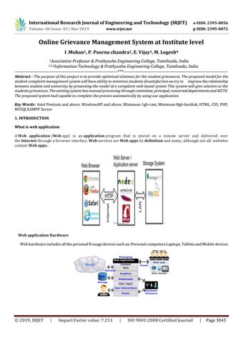 Abstract - The purpose of this project is to provide optimised solutions for the student grievances. The proposed model for the student complaint management system will have ability to minimize students dissatisfaction we try to improve the relationship between student and university by presenting the model of e-complaint web based system This system will give solution to the students grievances. The existing system has manual processing through committee, principal, concerned departments and AICTE. The proposed system had capable to complete the process automatically by using our application. Key Words: Intel Pentium and above, WindowsXP and above, Minimum-1gb-ram, Minimum-8gb-hardisk, HTML, CSS, PHP, MYSQLXAMPP Server 1. INTRODUCTION What is web application A Web application (Web app) is an application program that is stored on a remote server and delivered over the Internet through a browser interface. Web services are Web apps by definition and many, although not all, websites contain Web apps..