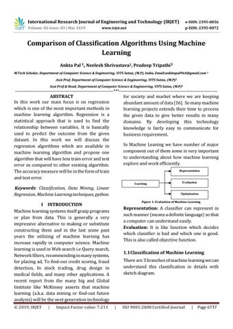 Comparison of Classification Algorithms Using Machine Learning Ankta Pal 1, Neelesh Shrivastava2, Pradeep Tripathi3 M.Tech Scholar, Department of Computer Science & Engineering, VITS Satna, (M.P), India, Email:ankitapal964@gmail.com 1 Asst Prof, Department of Computer Science & Engineering, VITS Satna, (M.P)2 Asst Prof & Head, Department of Computer Science & Engineering, VITS Satna, (M.P)3