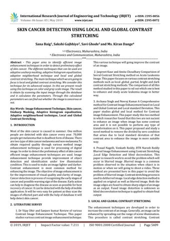 SKIN CANCER DETECTION USING LOCAL AND GLOBAL CONTRAST STRETCHING Sana Baig1, Sakshi Gajbhiye2, Savi Ghode3 and Ms. Kiran Dange4 1,2,3Electronics, Maharashtra, India Electronics and Communication, Maharashtra, India ---------------------------------------------------------------------***--------------------------------------------------------------------4