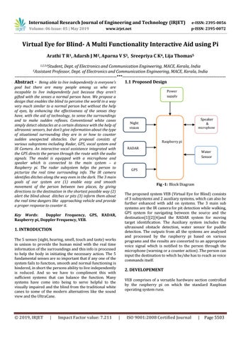Virtual Eye for Blind- A Multi Functionality Interactive Aid using Pi Arathi T R1, Adarsh J M2, Aparna V S3, Sreepriya C K4, Lija Thomas5 1,2,3,4Student,