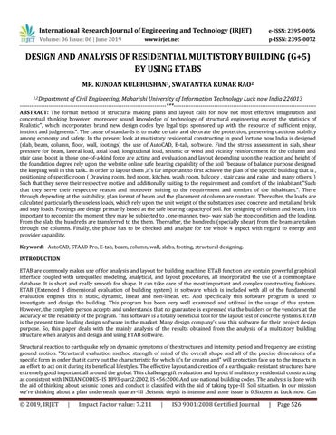 DESIGN AND ANALYSIS OF RESIDENTIAL MULTISTORY BUILDING (G+5) BY USING ETABS MR. KUNDAN KULBHUSHAN1, SWATANTRA KUMAR RAO2 1,2Department of Civil Engineering, Maharishi University of Information Technology Luck now India 226013 ----------------------------------------------------------------------------***--------------------------------------------------------------------------