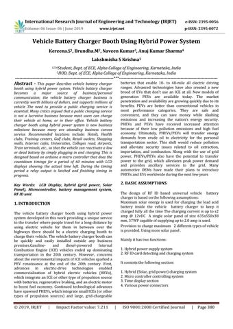 Vehicle Battery Charger Booth Using Hybrid Power System Kereena.S1, Brundha.M2, Naveen Kumar3, Anuj Kumar Sharma4 Lakshmisha S Krishna5 1234Student,