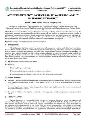 ARTIFICIAL METHOD TO INCREASE GROUND WATER RECHARGE BY BHHUNGROO TECHNOLOGY Snehal Sidram Shete1, Prof P.A. Hangargekar2 1ME