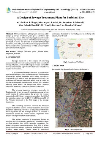 A Design of Sewage Treatment Plant for Parbhani City Mr. Shrikant S. Dhage1, Miss. Mayuri S. Joshi2, Mr. Suryakant S. Gaikwad3, Miss. Neha B. Mundlik4, Mr. Vinod J. Darekar5, Mr. Namdev S. Pawar6 1,2,3,4,5,6BE