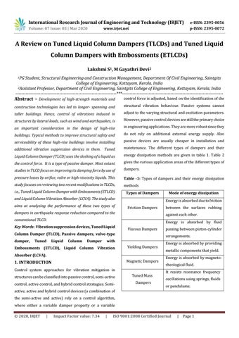A Review on Tuned Liquid Column Dampers (TLCDs) and Tuned Liquid Column Dampers with Embossments (ETLCDs) Lakshmi S1, M Gayathri Devi2 1PG