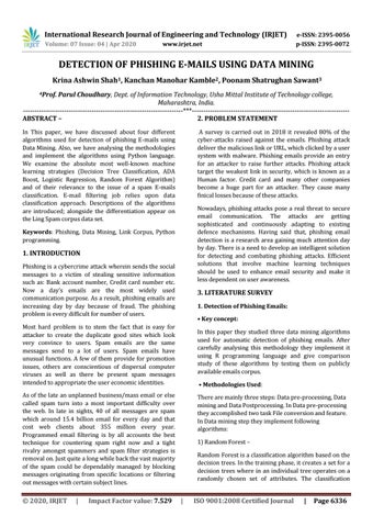 Parul Choudhary, Dept. of Information Technology, Usha Mittal Institute of Technology college, Maharashtra, India. ----------------------------------------------------------------------***--------------------------------------------------------------------ABSTRACT – 2. PROBLEM STATEMENT In This paper, we have discussed about four different algorithms used for detection of phishing E-mails using Data Mining. Also, we have analysing the methodologies and implement the algorithms using Python language. We examine the absolute most well-known machine learning strategies (Decision Tree Classification, ADA Boost, Logistic Regression, Random Forest Algorithm) and of their relevance to the issue of a spam E-mails classification. E-mail filtering job relies upon data classification approach. Descriptions of the algorithms are introduced; alongside the differentiation appear on the Ling Spam corpus data set.