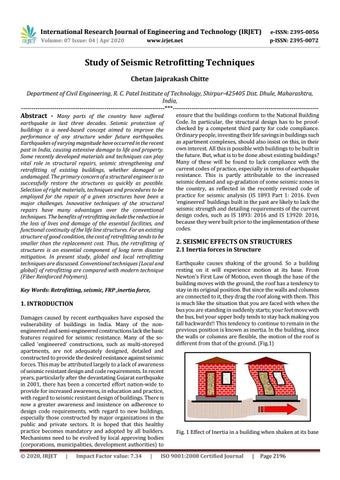 Study of Seismic Retrofitting Techniques Chetan Jaiprakash Chitte Department of Civil Engineering, R. C. Patel Institute of Technology, Shirpur-425405 Dist. Dhule, Maharashtra, India, ---------------------------------------------------------------------***----------------------------------------------------------------------