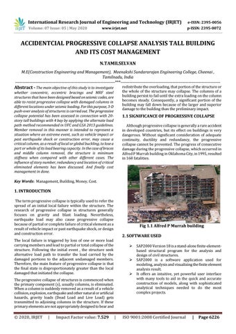 ACCIDENTCIAL PROGRESSIVE COLLAPSE ANALYSIS TALL BUILDING AND ITS COST MANAGEMENT N.TAMILSELVAN M.E(Construction Engineering and Management), Meenakshi Sundararajan Engineering College, Cheenai , Tamilnadu, India ---------------------------------------------------------------------***---------------------------------------------------------------------