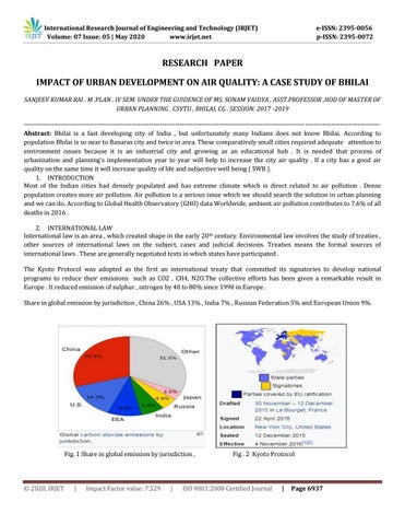 RESEARCH PAPER IMPACT OF URBAN DEVELOPMENT ON AIR QUALITY: A CASE STUDY OF BHILAI SANJEEV KUMAR RAI . M .PLAN . IV SEM. UNDER THE GUIDENCE OF MS. SONAM VAIDYA , ASST.PROFESSOR ,HOD OF MASTER OF URBAN PLANNING . CSVTU , BHILAI, CG . SESSION: 2017 -2019 -----------------------------------------------------------------------------------------------------------------------------------------------------------------Abstract: Bhilai is a fast developing city of India , but unfortunately many Indians does not know Bhilai. According to population Bhilai is so near to Banaras city and twice in area. These comparatively small cities required adequate attention to environment issues because it is an industrial city and growing as an educational hub . It is needed that process of urbanization and planning’s implementation year to year will help to increase the city air quality . If a city has a good air quality on the same time it will increase quality of life and subjective well being ( SWB ). 1. INTRODUCTION Most of the Indian cities had densely populated and has extreme climate which is direct related to air pollution . Dense population creates more air pollution. Air pollution is a serious issue which we should search the solution in urban planning and we can do. According to Global Health Observatory (GHO) data Worldwide, ambient air pollution contributes to 7.6% of all deaths in 2016 . 2. INTERNATIONAL LAW International law is an area , which created shape in the early 20 th century. Environmental law involves the study of treaties , other sources of international laws on the subject, cases and judicial decisions. Treaties means the formal sources of international laws . These are generally negotiated texts in which states have participated . The Kyoto Protocol was adopted as the first an international treaty that committed its signatories to develop national programs to reduce their emissions such as CO2 , CH4, N2O.The collective efforts has been given a remarkable result in Europe . It reduced emission of sulphur , nitrogen by 40 to 80% since 1990 in Europe . Share in global emission by jurisdiction , China 26% , USA 13% , India 7% , Russian Federation 5% and European Union 9%.