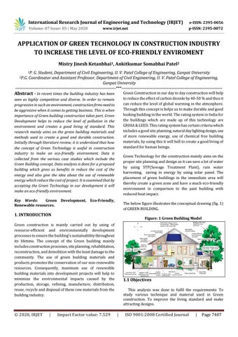 APPLICATION OF GREEN TECHNOLOGY IN CONSTRUCTION INDUSTRY TO INCREASE THE LEVEL OF ECO-FRIENDLY ENVIROMENT Mistry Jinesh Ketanbhai1, Ankitkumar Somabhai Patel2 G. Student, Department of Civil Engineering, U. V. Patel College of Engineering, Ganpat University Coordinator and Assistant Professor, Department of Civil Engineering, U. V. Patel College of Engineering, Ganpat University ---------------------------------------------------------------------***--------------------------------------------------------------------2P.G.