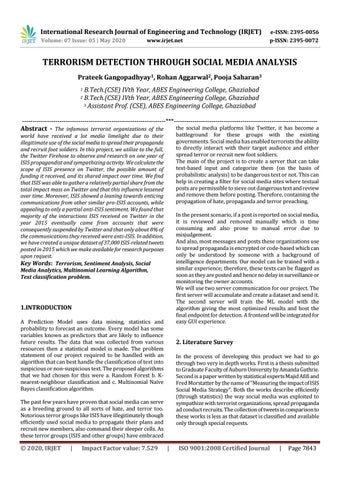 TERRORISM DETECTION THROUGH SOCIAL MEDIA ANALYSIS Prateek Gangopadhyay1, Rohan Aggarwal2, Pooja Saharan3 1 2