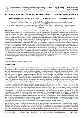 FLUORESCENT DYEING IN POLYESTER AND COTTON BLENDED FABRICS SHREE LALEITHA G1, ASHOK KUMAR A2, PRITHIVRAJ G3, VIPIN V4, SATHISH KUMAR M5 1,2Assistant