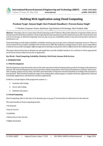 Abstract - Nowadays, there is a buzz about Cloud Computing in the IT industry. Most of the industries, irrespective of their size are moving towards Cloud-based solutions. Cloud computing has been buzzing around the industry because of its characteristics such as low-cost storage, on-demand computing resources, pay as you use, availability of data at any time and any place and ease in maintenance, etc. Cloud technology provides high availability, scalability, elasticity, pay as you go, and on-demand computing resources. There are various Cloud service providers available in the market such as AWS, Microsoft Azure, Google Cloud, etc. Here, we are using AWS as a cloud service provider and apply a different approach to develop a web portal, which is different from the traditional approach. This paper demonstrates how to develop any web application, provide multiple interfaces to it, and how to choose appropriate services from Amazon Web Services for an application. Key Words: Cloud Computing, Scalability, Elasticity, Web Portal, Amazon Web Services 1. INTRODUCTION 1.1 Web Development Web Development comprehensively refers to the tasks associated with developing online portals for hosting via the internet or intranet. The web development process incorporates website composition, web content development, customer-side/serverside scripting, system security setup, and other associated tasks. It empowers site functionalities according to the proprietor’s prerequisites. Web Portal development ranges from making plain content pages to complex electronic applications, informal community applications, and electronic business applications. It follows a certain degree of the progressive system i.e.: 1.