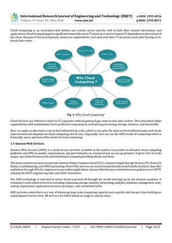 Fig -1: Why Cloud Computing? Cloud Services are utilized to improve IT capacities without putting huge sums in new data centers. This innovation helps organizations with substantially more proficient computing by centralizing processing, storage, memory, and bandwidth. Here, we apply an alternative way to deal with build up a site, which is not quite the same as the traditional approach of site improvement and depends on cloud computing and its uses. Especially, here we use the AWS model of computing which is financially savvy and best of the model of cloud computing. 1.3 Amazon Web Services Amazon Web Services (AWS) is a cloud service provider available in the market. It provides on-demand cloud computing platforms and APIs to people, organizations, and governments, on a metered pay-as-you-go premise. It gives a lot of crude unique specialized frameworks and distributed computing building blocks and tools. The most common services incorporate Amazon Elastic Compute Cloud (EC2), Amazon Simple Storage Service (S3), Route 53, Elastic Load Balancing, and AWS Autoscaling. Most of the services are not presented directly to end clients, however, they offer usefulness through APIs for engineers to use in their applications. Amazon Web Services contributions are gotten to over HTTP, utilizing the REST engineering style and SOAP convention. The AWS technology is executed at server farms executed all through the world and kept up by the Amazon auxiliary. It contained a wide extent of services including computing, storage, memory, networking, analytics, database, management, autoscaling, deployment, application services, developer, and automation tools. AWS provides subscribers as a way of obtaining large scale computing capacity more quickly and cheaper than building an actual physical server farm. All services are billed based on usage in various ways.