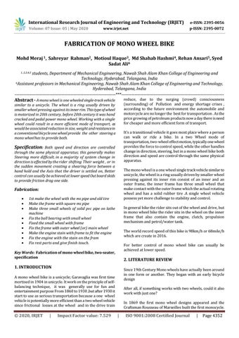 FABRICATION OF MONO WHEEL BIKE Mohd Meraj 1, Sahreyar Rahman2, Motioul Haque3, Md Shahab Hashmi4, Rehan Ansari5, Syed Sadat Ali6 students, Department of Mechanical Engineering, Nawab Shah Alam Khan College of Engineering and Technology, Hyderabad, Telangana, India 6Assistant professors in Mechanical Engineering, Nawab Shah Alam Khan College of Engineering and Technology, Hyderabad, Telangana, India ---------------------------------------------------------------------***---------------------------------------------------------------------1, 2,3,4,5