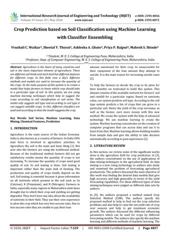 Crop Prediction based on Soil Classification using Machine Learning with Classifier Ensembling Vrushali C. Waikar1, Sheetal Y. Thorat2, Ashlesha A. Ghute3, Priya P. Rajput4, Mahesh S. Shinde5 M. E. S. College of Engineering Pune, Maharashtra, India Dept. of Computer Engineering, M. E. S. College of Engineering Pune, Maharashtra, India -----------------------------------------------------------------------***-------------------------------------------------------------------5Professor,
