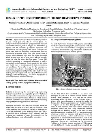 of Mechanical Engineering Department, Nawab Shah Alam Khan College of Engineering and Technology, Hyderabad, Telangana, India 4Professor and Head of Department in Mechanical Engineering, Nawab Shah Alam Khan College of Engineering and Technology, Hyderabad, Telangana, India. ---------------------------------------------------------------------***---------------------------------------------------------------------Abstract - Pipelines are important means of transportation 1.1 Early Robotic Inspection Systems of gas, water, fuel oils, etc. in various fields. The transportation loss occurs due to aging, corrosion, obstacles, crack and mechanical faults in the pipe line. The lifetime of pipeline can be increased by regular inspections and maintenance and recognizing the cracks, damages and faults. This helps in preventing transportation loss and maintaining profitable gross. Thus, this project aims to propose an autonomous robot used for in-pipe inspection which provides easy way of detecting crack and obstacles inside the pipe by using Non-Destructive Testing. This project is conceived to redesign the electronic as well as mechanical control systems. Requirements for the robot were that it must be able to operate in dark, compact and wet conditions. This is also to do for the redesign and construction of such robot. Its employees the electronic and mechanical components and provides video feedback via a custom graphic interface with the help of Non-Destructive Testing (Dye Penetrant Testing.). this allows the operator to operator to operate the robot remotely.
