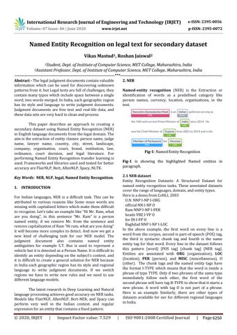 Key Words: NER, NLP, legal, Named Entity Recognition. 1. INTRODUCTION For Indian languages, NER is a difficult task. This can be attributed to various reasons like Some noun words are missing with capitalized letters which make them difficult to recognize. Let's take an example like “Hi Mr. Ram, what are you doing”, in this sentence “Mr. Ram” is a person named entity, if we remove Mr. from the sentence and remove capitalization of Ram “Hi ram, what are you doing” it will become more complex to detect. And now we get a new kind of challenging task for our NER model. The judgment document also contains named entity ambiguities for example S.T. Bus is used to represent a vehicle but it is detected as a Person Name. It is difficult to identify an entity depending on the subject's context. and it is difficult to create a general solution for NER because in India each geographic region has its style and regional language to write judgment documents. If we switch regions we have to write new rules and we need to use different language models. The latest research in Deep Learning and Natural language processing achieves good accuracy on NER tasks. Models like FlairNLP, AllenNLP, Bert-NER, and Spacy can perform very well in the Indian context. and regular expression for an entity that contains a fixed pattern.