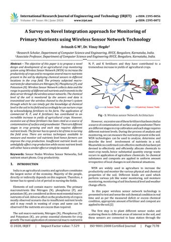 A Survey on Novel Integration approach for Monitoring of Primary Nutrients using Wireless Sensor Network Technology Avinash G M1, Dr. Vinay Hegde2 1Research