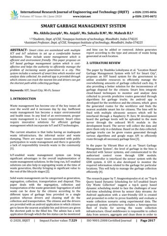 SMART GARBAGE MANAGEMENT SYSTEM Ms. Akhila Joseph1, Ms. Anjali2, Ms. Suhaila B.M3, Mr. Mahesh B.L4 1,2,3Students,