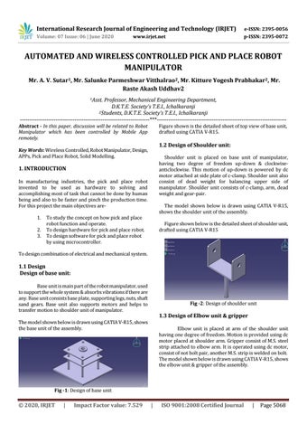 AUTOMATED AND WIRELESS CONTROLLED PICK AND PLACE ROBOT MANIPULATOR Mr. A. V. Sutar1, Mr. Salunke Parmeshwar Vitthalrao2, Mr. Kitture Yogesh Prabhakar2, Mr. Raste Akash Uddhav2 1Asst.