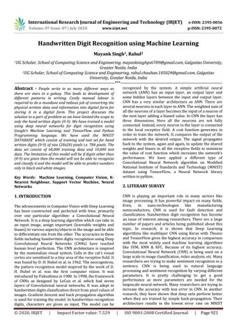 there are stars in a galaxy. This leads to development of different patterns in writing. Costly manual labour is required to do a mundane and tedious job of converting the physical written data and information into digital form for storing it in a digital form. This project discusses the solution to a part of problem as we have limited the scope to only the hand written digits (0-9). We have trained a model using deep neural networks for digit recognition using Google’s Machine Learning tool TensorFlow and Python Programming language. We have used the ‘MNIST DATABASE’ which consist of training and test set for hand written digits (0-9) of size (28x28) pixels i.e. 784 pixels. The data set consist of 60,000 training data and 10,000 test data. The limitation of this model will be if digits other than (0-9) are given then the model will not be able to recognize and classify it and the model will be able to predict numbers only in black and white images. Key Words: Machine Learning, Computer Vision, KNearest Neighbour, Support Vector Machine, Neural Networks
