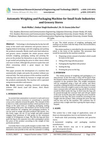 Automatic Weighing and Packaging Machine for Small Scale Industries and Grocery Stores Kush Midha1, Omkar Singh Kushwaha2, Dr. D. Gnana Jeba Das3 1U.G.